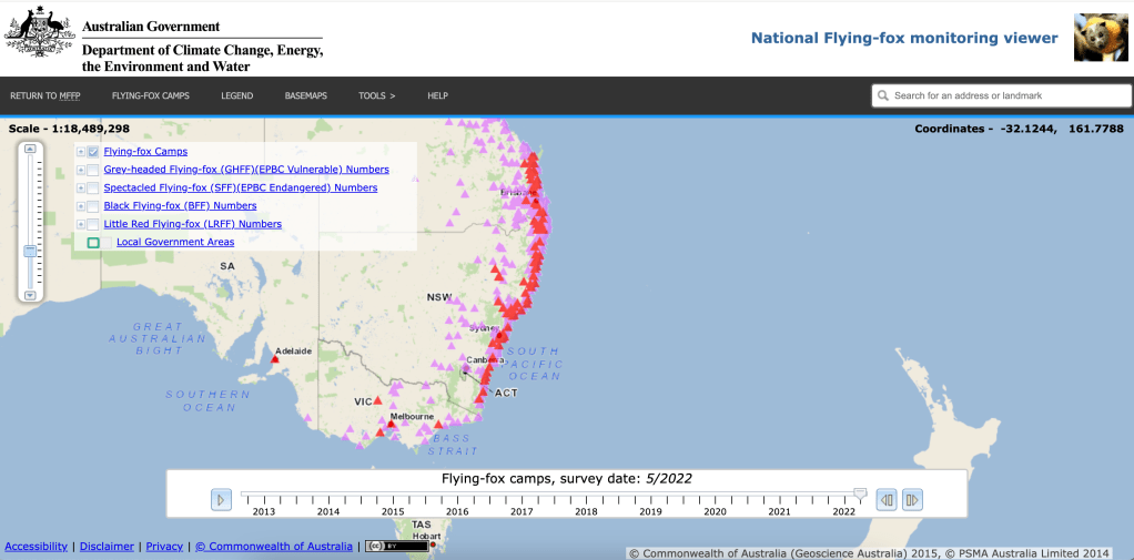 The Australian Government has a really cool interactive Flying Fox Monitoring Site but observations seem to end in 2022. See: http://www.environment.gov.au/webgis-framework/apps/ffc-wide/ffc-wide.jsf.