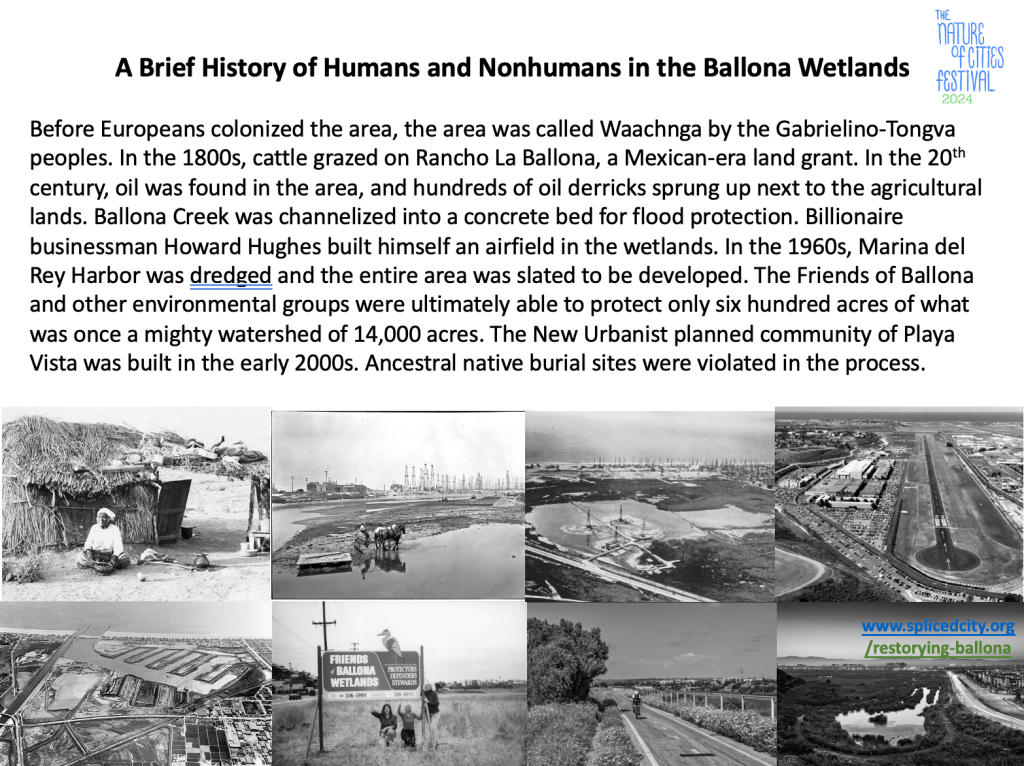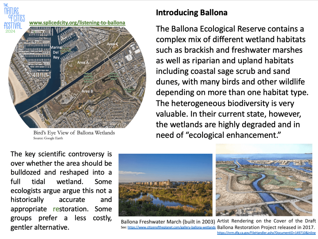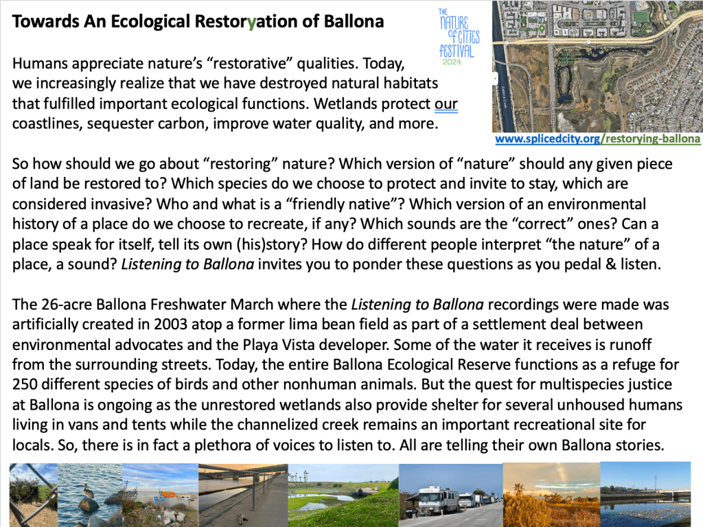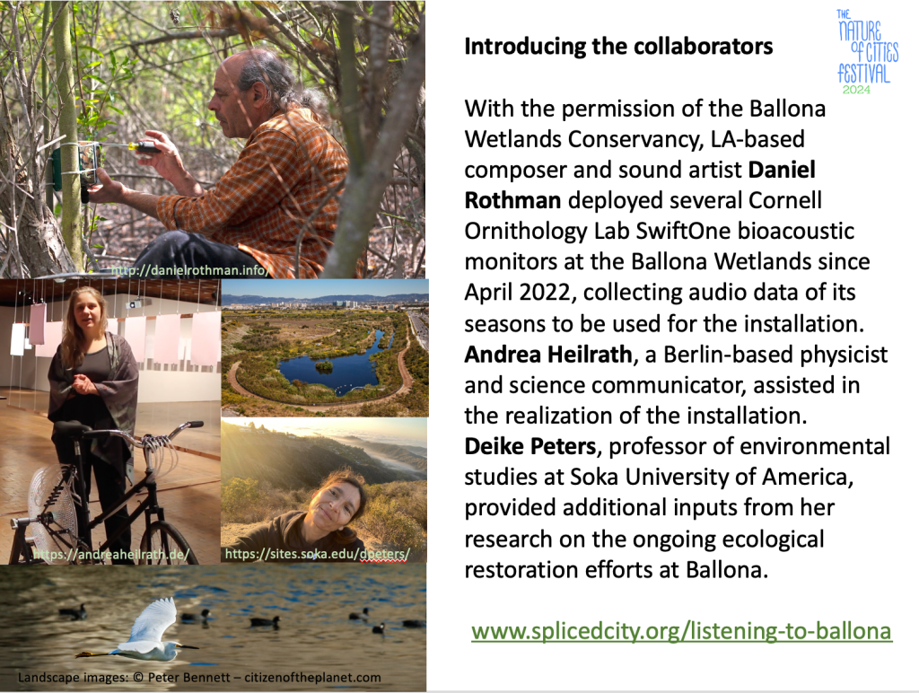 The slides below are based on the mini-posters we hung on the walls to introduce visitors to both the installation and the Ballona Wetlands. We intend to continue our collaboration and bring another Ballona Listening event to an audience closer to home in Southern California in early 2025.